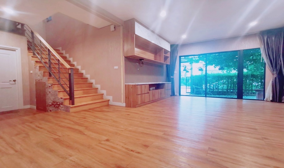 ด้านหลังบ้านก็เป็นบ่อปลาต้นมะพร้าวธรรมชาติมากไม่ชนกับใคร ดูวิวเย็นสบายลมถ่ายเท หน้าบ้านโดนแดดเช้า ชั้นล่างได้ปูกระเบี้ยงยางอย่างหนา ผ้าม่านของอิตาลี่อย่างดีทั้งบ้าน